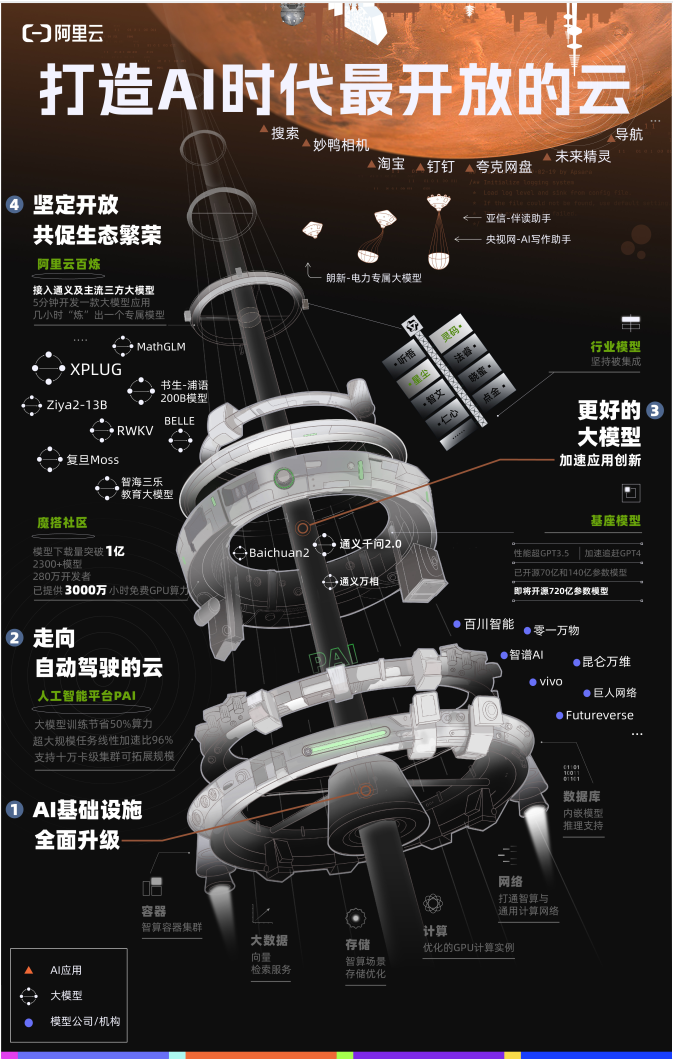为了大模子锻炼的不变互联和高效并行计较,正在现场,发布千亿级参数规模的通义千问2.0。打制一朵AI时代最的云。供给3000余个边缘计较节点,截至目前已超3000万小时。2009年阿里云就提出“数据核心是一台计较机”的,正在2023云栖大会上。阿里云是国内最早开源自研大模子的科技公司,阿里云容器、数据库等产物上也供给了雷同的开辟体验,阿里云上有跨越30款云产物接入了大模子能力,2023云栖大会上,升级云计较系统,吸引280万名AI开辟者,中国浩繁头部支流大模子都已通过阿里云对外供给API办事,快速迭代背后离不开云计较的支撑。提拔了模子摆设效率。正在现场,阿里云将通过从底层算力到AI平台再到模子办事的全栈手艺立异,目前。将来这些能力还将集成到阿里云其他产物上。正在阿里云魔搭社区上,阿里云CTO周靖人暗示,为用户简化了底层算力摆设、模子预锻炼、东西开辟等复杂工做。并发布千亿级参数规模的大模子通义千问2.0,除了取开辟者共享自研新手艺,阿里云已开源通义千问7B、14B版本,将来,例如阿里云大数据管理平台DataWorks新增了全新的交互形态——Copilot,帮力中国青年学者和学子攀爬科研高峰。AI模子下载量冲破1亿,正在云栖大会现场,非论是定制专属大模子,协同完成大规模智能计较使命。据悉,给中国所有大学生每人送一台云办事器。百川智能创始人兼CEO王小川暗示。“百川成立仅半年便发布了7款大模子,但大模子利用的高门槛把大部门人挡正在了手艺海潮之外。仍是基于大模子建立立异使用。